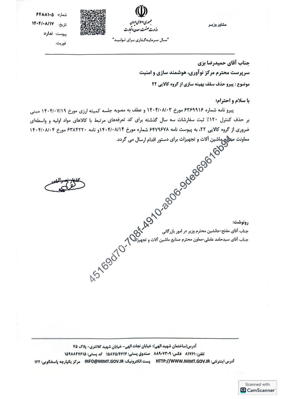 در این نامه آمده است: پیرو نامه شماره ۶۳۶۹۹۱۶ مورخ ۳ آبان ۱۴۰۴ و عطف به مصوبه جلسه کمیته ارزی مورخ ۱۹ مهر ۱۴۰۴ مبنی بر حذف کنترل ۱۲۰ درصد ثبت سفارشات سه سال گذشته برای کد تعرفههای مرتبط با کالاهای مواد اولیه و واسطهای ضروری از گروه کالایی ۲۲، به پیوست نامه ۶۴۷۹۶۷۸ شماره مورخ ۱۴ آبان ۱۴۰۴ و نامه ۶۳۸۴۲۲۰ مورخ ۴ آبان ۱۴۰۴ معاونت صنایع ماشین آلات و تجهیزات برای دستور اقدام ارسال میگردد.