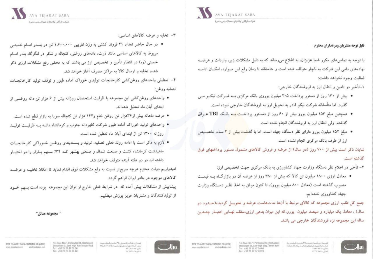 مجموعه مدلل مدعی است، تاخیر در تامین و انتقال ارز، تاخیر وزارت جهاد جهت تخصیص ارز، تخلیه و عرضه کالاهای اساسی و تعطیلی واحدهای روغنکشی را باعث توقف و عرضه نهادههای دامی شده است.